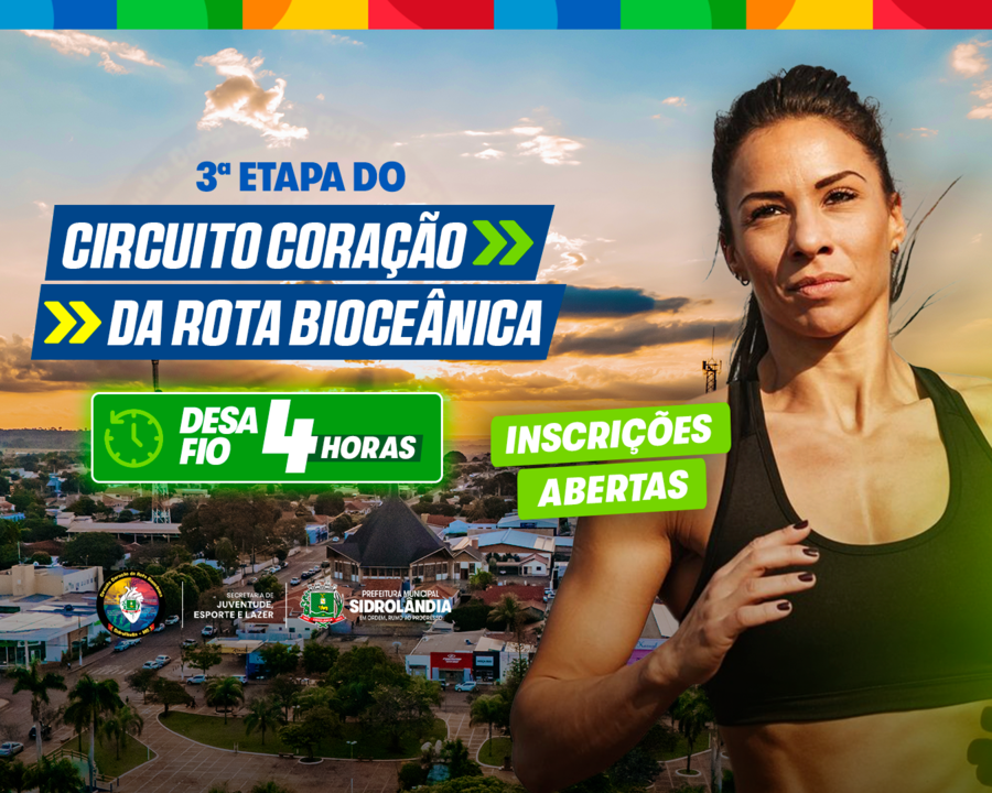 A Prefeitura de Sidrolândia, por meio da Fundação de Esporte, em parceria com a Federação de Atletismo de Mato Grosso do Sul e a RankBrasil, promove no dia 28 de setembro a 3ª etapa do Circuito Coração da Rota Bioceânica – Desafio 4 Horas. O evento será realizado no Parque de Exposições, com largada prevista para às 6h da manhã.