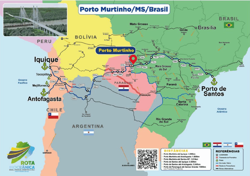 Corredor: A Rota Bioceânica é um corredor logístico que visa ligar o Oceano Atlântico ao Oceano Pacífico, atravessando a América do Sul por meio de infraestruturas rodoviárias, e que deve impulsionar o desenvolvimento econômico do Brasil, Paraguai, Argentina e Chile, reduzindo custos e tempos de transporte entre a América Latina e os mercados asiáticos. A obra central, a ponte binacional sobre o Rio Paraguai, que liga Porto Murtinho (Brasil) e Carmelo Peralta (Paraguai), tem um avanço significativo, com o objetivo de consolidar este corredor estratégico.
