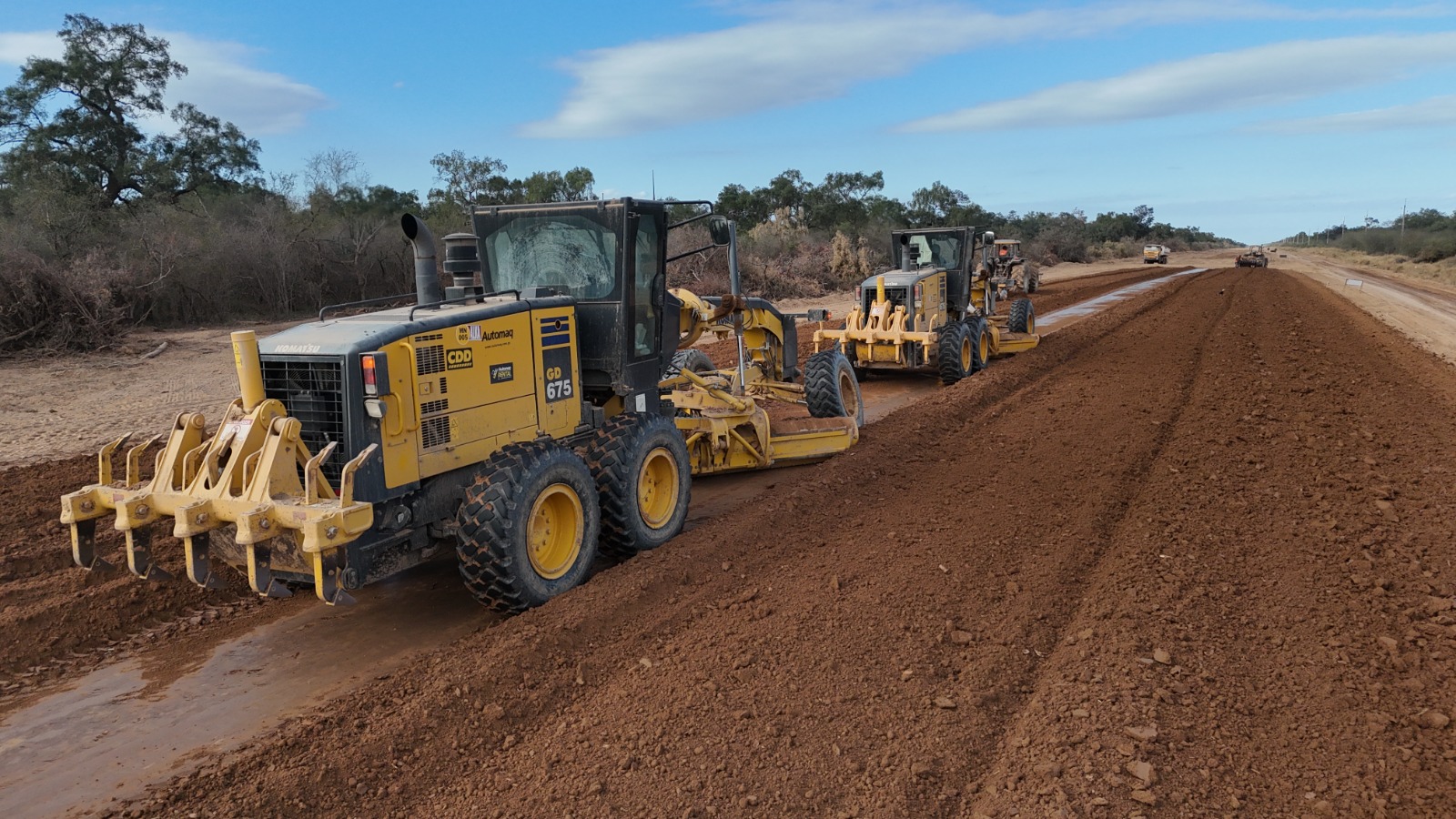 Na área de construção, a assistência técnica, a preparação do canteiro de obras, a movimentação de terra, a limpeza da faixa de terra, a escavação de bolsões e a construção do aterro, e a remoção e realocação de linhas de energia já foram concluídas. Na pavimentação, houve progresso na aplicação do subleito com cal, e a prioridade foi dada à sinalização na Picada Lóbrego.