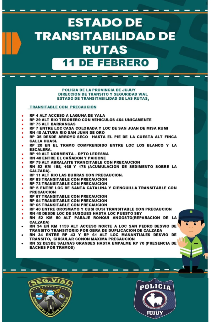 A Polícia Provincial de Jujuy , por meio da Diretoria de Trânsito e Segurança Rodoviária , divulgou o relatório atualizado sobre o estado do tráfego referente a quarta-feira, 11 de fevereiro , que detalha diversos trechos com tráfego liberado, porém sob estrita cautela.