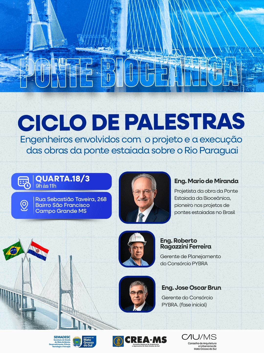 O evento reunirá os engenheiros responsáveis pelo projeto e execução da ponte estaiada sobre o Rio Paraguai, que conecta as cidades de Porto Murtinho e Carmelo Peralta, estrutura considerada peça-chave para a consolidação da Rota Bioceânica.