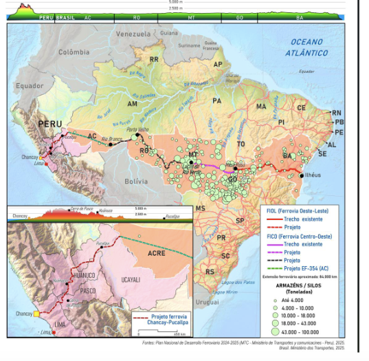 O projeto da Ferrovia Bioceânica, uma ambiciosa iniciativa de infraestrutura ferroviária que busca conectar os oceanos Pacífico e Atlântico através do Peru e do Brasil, voltou a ganhar destaque após a inauguração do megaporto de Chancay, na costa peruana. Este projeto ligaria os dois oceanos por meio de um corredor ferroviário que atravessaria a Cordilheira dos Andes e vastas áreas da floresta amazônica.