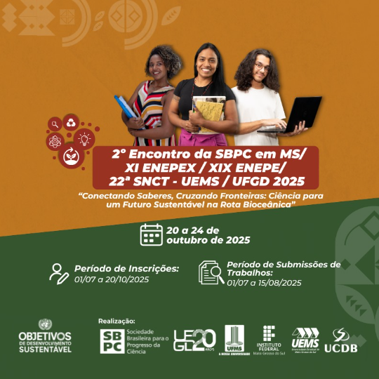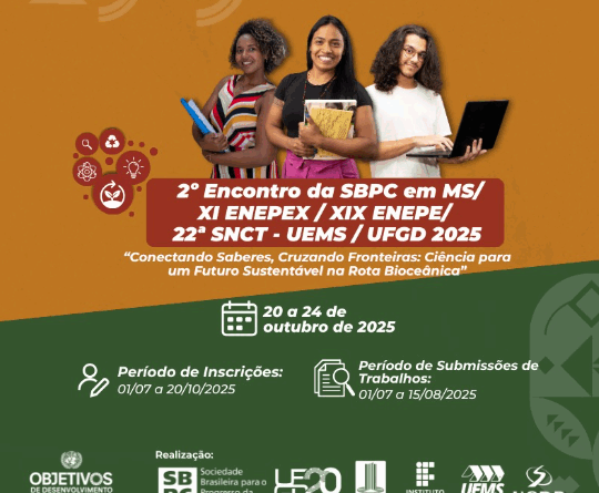 A Universidade Estadual de Mato Grosso do Sul (UEMS), em parceria com a Universidade Federal da Grande Dourados (UFGD), promove entre os dias 20 e 24 de outubro de 2025 o XI ENEPEX / XV EPEX – UEMS e XIX ENEPE – UFGD. O evento, tradicional na agenda acadêmica da região, integra as atividades da Semana Nacional de Ciência e Tecnologia e terá como tema “Conectando Saberes, Cruzando Fronteiras: Ciência para um Futuro Sustentável na Rota Bioceânica”.